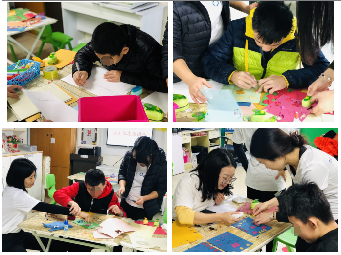 2018年12月15日,恰逢周六,福美信志愿者们来到深圳市罗湖区仁爱康复服务中心的职康部,关爱并陪伴职康部成员进行课堂融入活动. 首先由深圳市罗湖区仁爱康复服务中心的老师给志愿者们作了一次简短的志愿者培训,志愿者们对于我们的成员有了更多、更细致的了解,也懂得如何与心智障碍者交流与合作,如此使得接下来与成员们相处更加的得心应手,在老师的指引下,志愿者们协助成员动手制作起了手工贺卡。