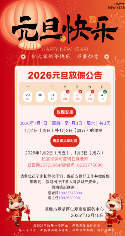 您好!值此辞旧迎新之际,根据国务院办公厅关于2026年节假日安排的通知精神,结合中心实际,现将元旦放假安排及注意事项详细通知如下,请孩子家长及伙伴们仔细阅读并配合执行。