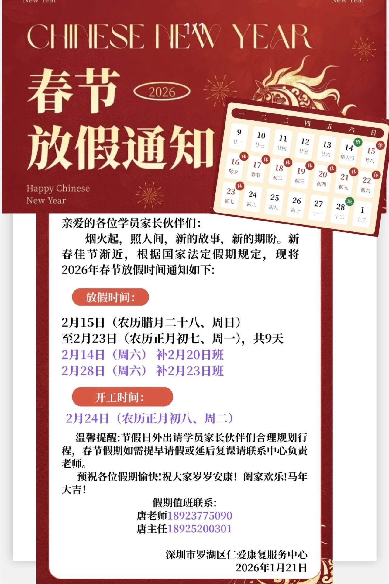 喜启马年啦!!仁爱康复中心放假通知请查收